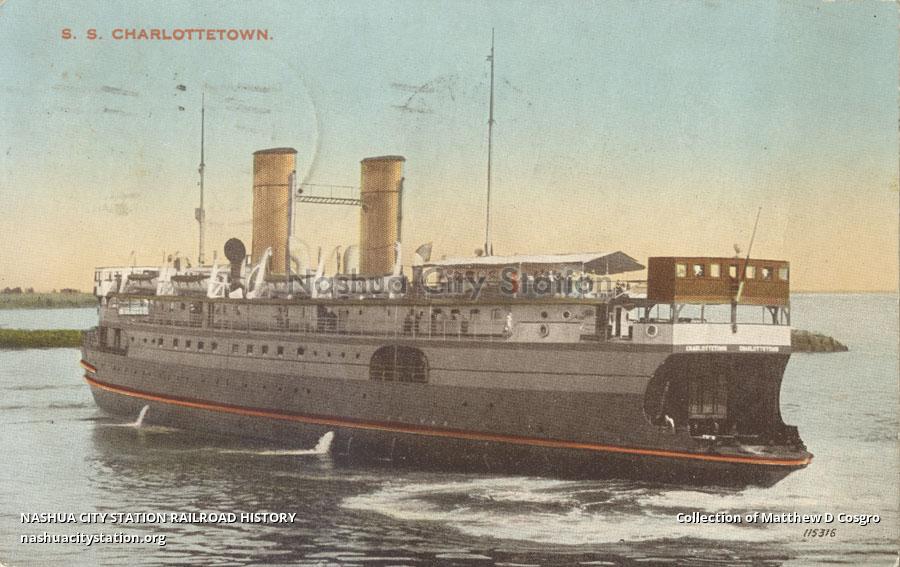 The Ice Breaking Car Ferry "S. S. Charlottetown" operated by Canadian National Railways across Northumberland Strait between Borden, Prince Edward Island and Tormentine, New Brunswick. Length overall, 342 feet; Breadth, 59 feet; Draft, 19.5 feet; Accommodating 40 automobiles and 3 railway tracks accomodating 16 freight cars, First Class Restaurant on Board and News Stand.