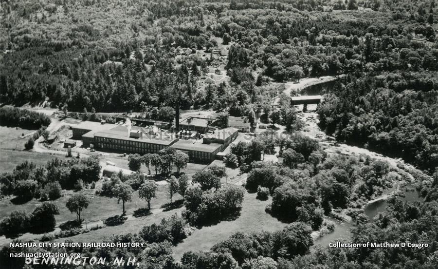 The Worcester and Hillsboro Branch passed behind the paper mill, with the railroad covered bridge over the Contoocook River visible to the right of the mill.