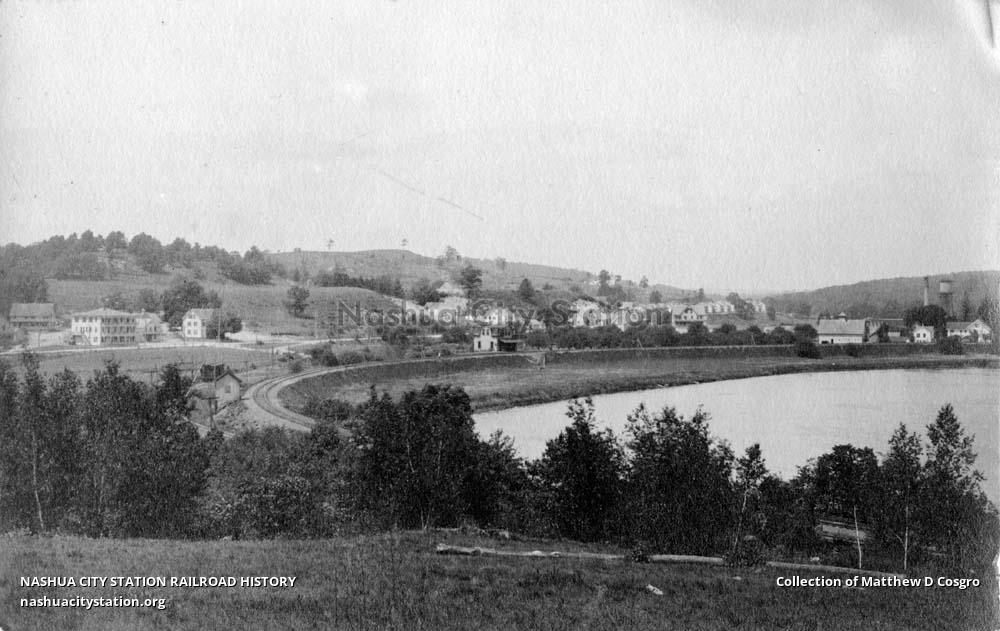 Tafts depot at center of photo. Taftville Branch diverges from main line at bottom right and bends to right behind Tafts depot and heads toward Taftville in distance at center right.