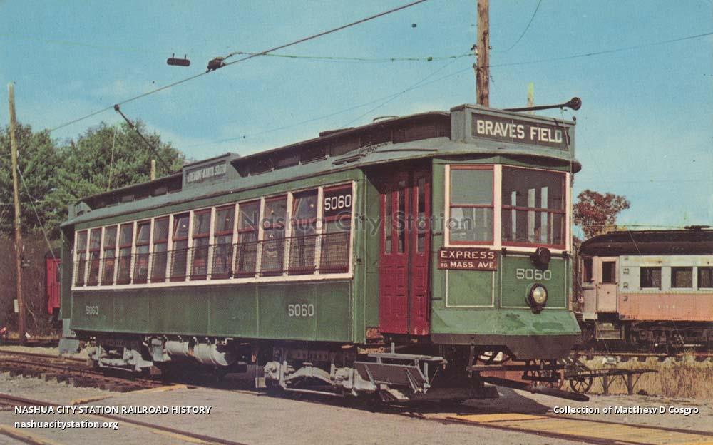 Sesahore's No. 5060 is one of 50 semi-convertibles built by the J. G. Brill Company of Philadelphia, Pennsylvania, for the Boston Elevated Railway in 1906, and initially was operated in the East Boston Tunnel. Later transferred to surface routes, they were all retired between 1922 and 1929. No. 5060 was converted to a compressor car for the Boston Elevated's maintenance department in 1928 and was acquired in 1954 by the Seashore museum, where its reconversion to a passenger car is in progress.
