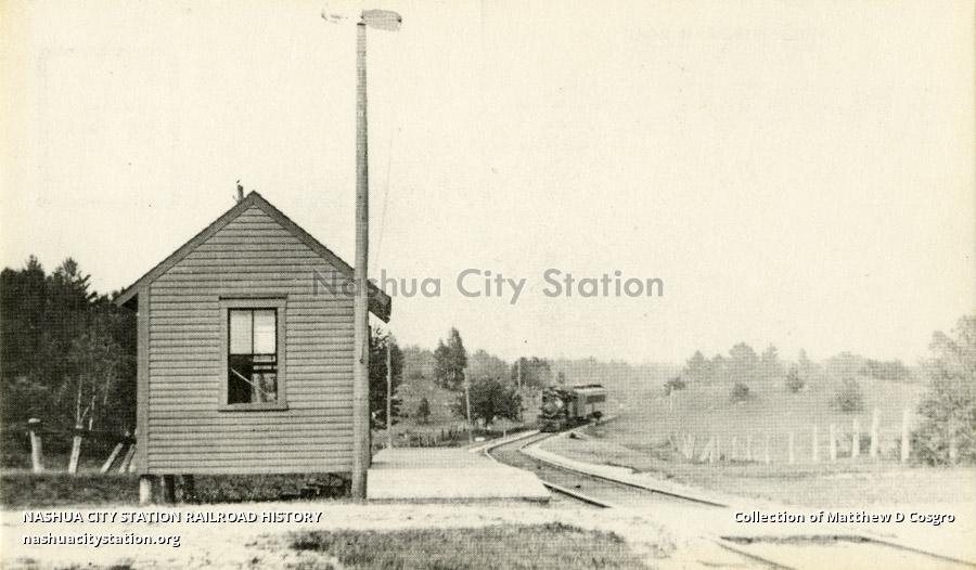 Fernald Station, about 1910. As many as 10 trains a day stopped at this station (on Gov. Wentworth Highway). Note the hand operated "flag" to signal the train to stop for passengers.