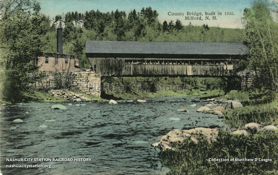 The first bridge between Milford and Wilton, built across the Souhegan River in the Mile Slip agreeably to an act of the General Court, passed April 2, 1779, was swept away by the great freshet in Jan. 31, 1835. In the summer this "County Bridge" was rebuilt, same being repaired in 1908. It is one of Lang's patent three-truss bridges.