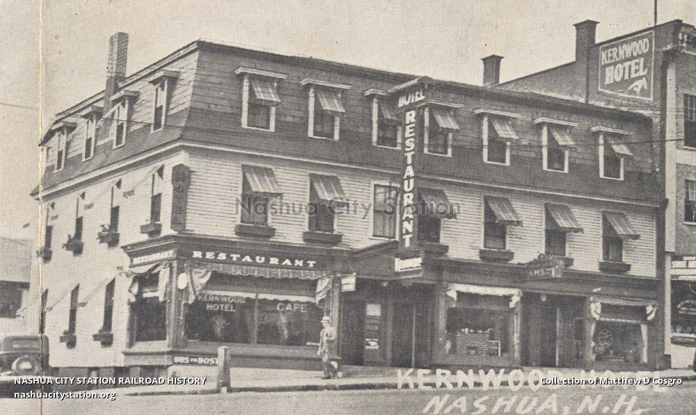 Kernwood Hotel at Nashua, New Hampshire, is located on Main Street in Railroad Square, opposite the Library. Thirty-five comfortably furnished rooms; reasonable rates. We have two Dining Rooms and the "Brick Oven" Coffee Shop, with a total seating capacity of one hundred and fifty - Quick, polite service, popular prices. When coming to Nashua make The KERNWOOD HOTEL your home. "An Excellent Place to Eat and Sleep"