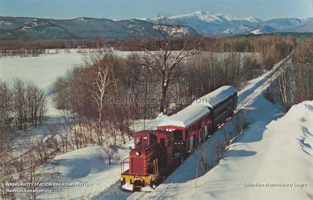 Conway Scenic Railroad diesel locomotive No. 15 and a two car passenger train on a mid-winter run near North Conway, New Hampshire.
