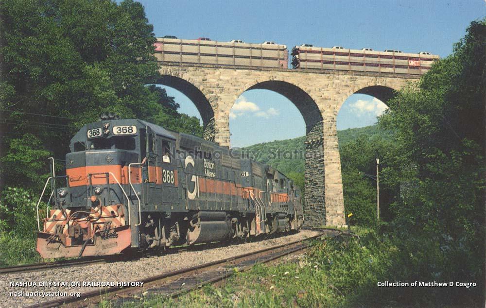 Boston & Maine 368 and 361 pass under Starrucca Viaduct southbound with Delaware & Hudson train RC-1 at Lanesboro, Pennsylvania, July 27, 1985. Guilford Industries owns and operates the Boston & Maine, Delaware & Hudson and Maine Central Railroads. Locomotives 368 and 361 are former D&H GP39-2's.