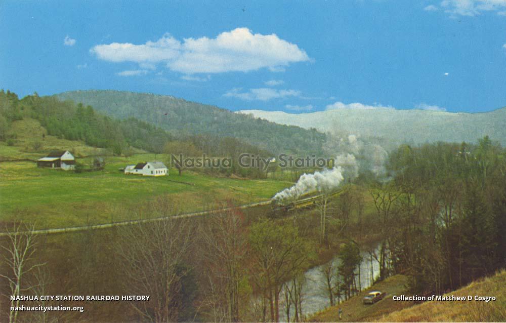 Old #15 (Baldwin 1916 2-8-0) steams up the Williams River Valley in spring 1968. Engine now on view at the Steamtown Collection.