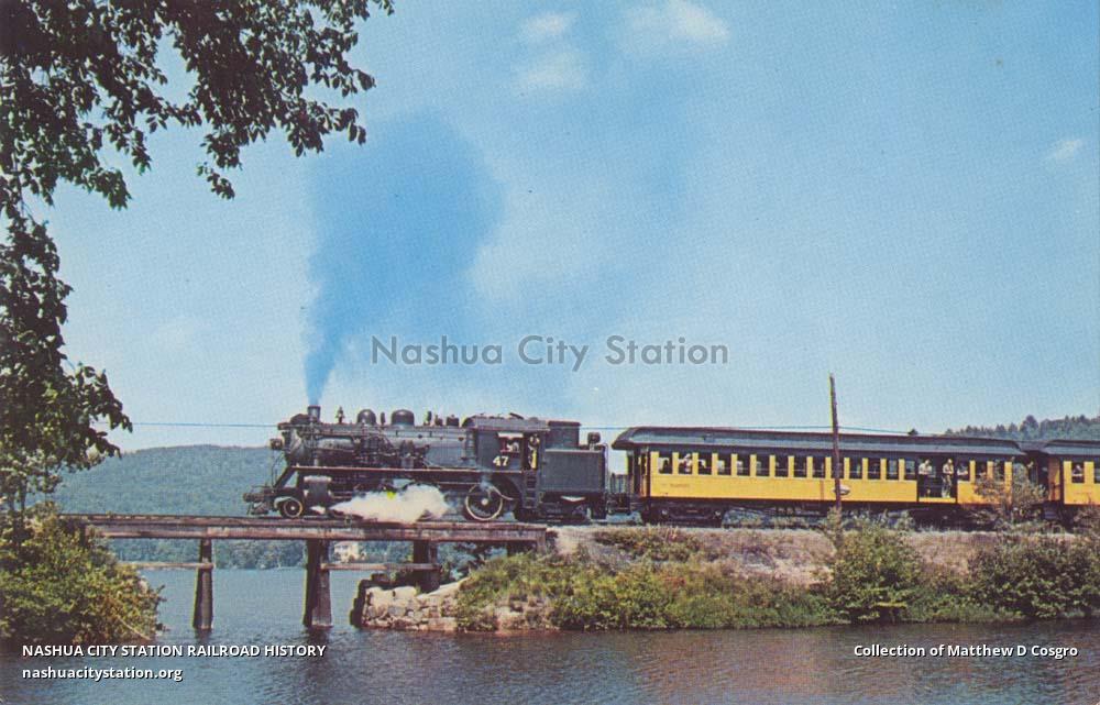 Monadnock, Steamtown & Northern's #47 ex-CNR 4-6-4T, with old time coaches, crosses Todd's Pond at Bradford, New Hampshire, New Hampshire on Claremont & Concord rails during 1961 season. MS&N now operates trains on Boston & Maine out of Keene, New Hampshire. #47 is now based at NS&N North Walpole, New Hampshire, terminal.