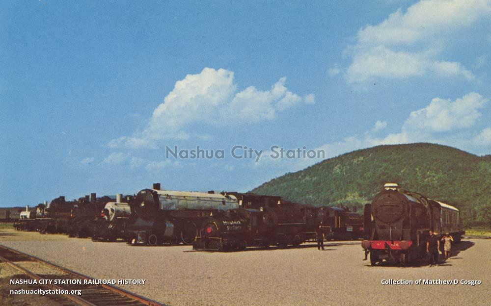 The nearest locomotive on the right is British "Repton" No. 926 - next left, Bullard No. 2, Canadian Pacific No. 2929, Norwood & St. Lawrence No. 210, and the line goes down the track with many steam trains from the past.