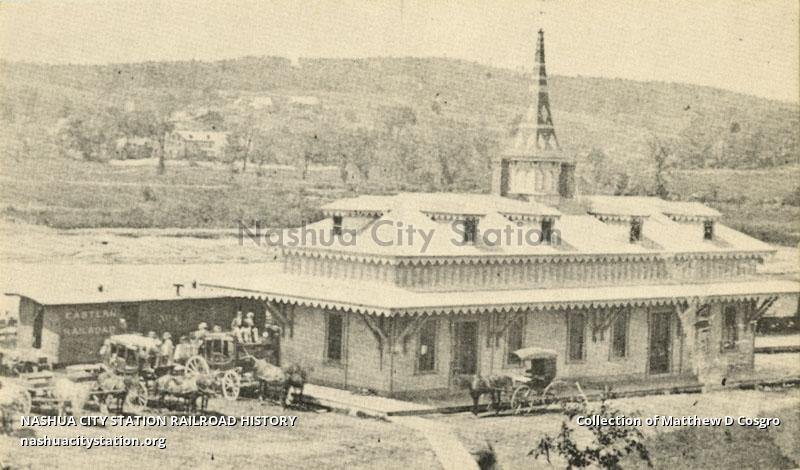 Wolfeboro Station about 1875. Note the Eastern Railroad train, and the two stagecoaches loading for the hotels and Melvin Village.