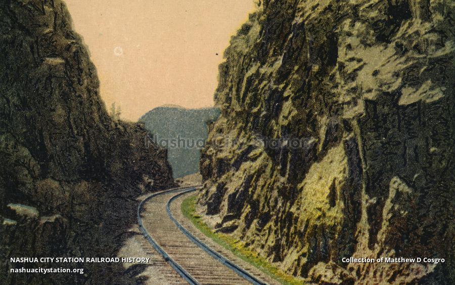 The Upper Gate to Crawford Notch. Here between the narowly separated mountain walls, the railroad, the carriage road and the infant Saco struggle for passage. The carriage road dips smoothly down into the bowl-like Crawford Notch from this point until it reaches the bottom of the valley, where it follows the ever growing Saco through to Bartlett. Upon a high ledge cut for its passage by its engineers follows also the railroad far above the tree-tops.