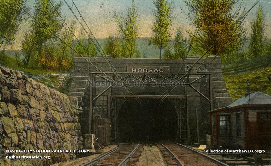 Hoosac Tunnel was commenced in 1851 and completed in 1875. The total length 4.75 miles long and is the longest tunnel in the United States. Rock excavated 1,900,000 tons. Men employed during construction were about 900. Lives lost 192. Width 24 feet, height 20 feet. Equipped with Electrical service 1911.