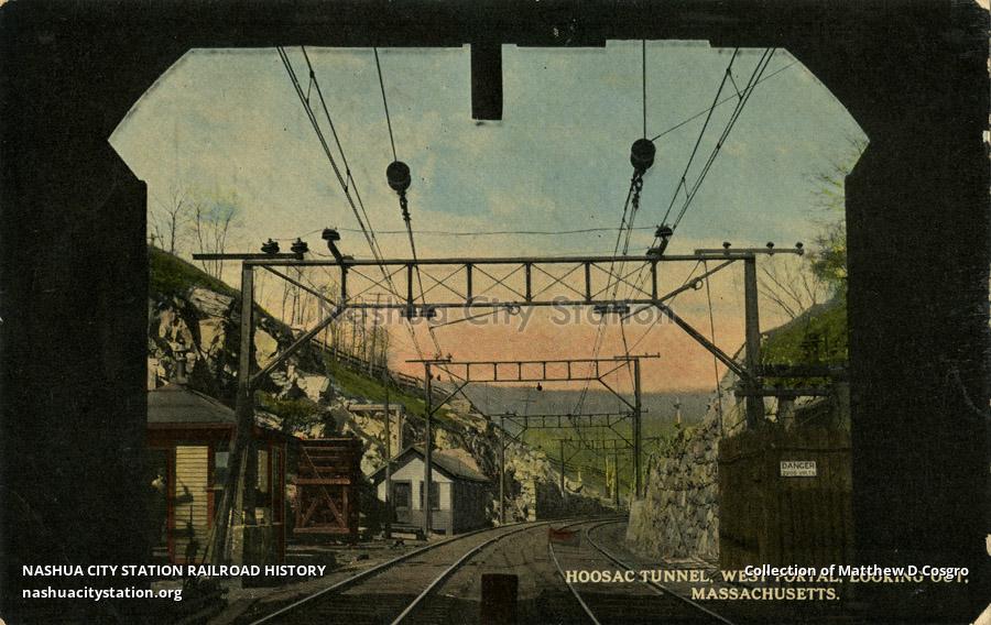 Hoosac Tunnel was commenced in 1851 and completed in 1875. The total length 4.75 miles long and is the longest tunnel in the United States. Rock excavated 1,900,000 tons. Men employed during construction were about 900. Lives lost 192. Width 24 feet, height 20 feet. Equipped with Electrical service 1911.
