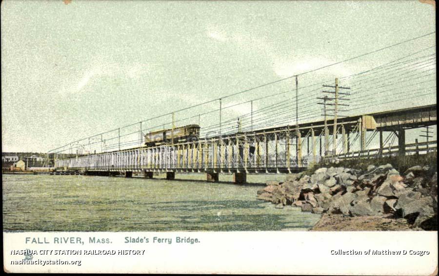 Slade's Ferry Bridge, which crosses the Taunton River at Fall River, is an iron drawbridge, with brick abutment. Overhead are tracks for the steam cars, and beneath, a way for teams and pedestrians. A few years ago the bridge was thought to be sinking, but after a survey by engineers, it was found to have sunk but 1/4 of an inch since its erection. It was completed in 1876 and is now too small for traffic.