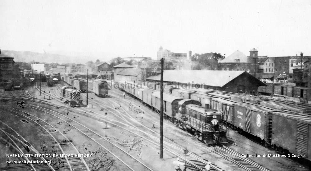 A Rutland train is lead by a Boston & Maine Alco RS-2 through the yard.
