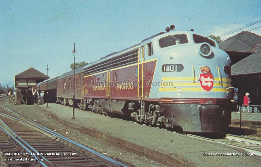 Only three E8A Diesel Locomotives operated in Canada and all were in Canadian Pacific service. Number 1801, built by GMD in 1949, has arrived at Westmount, Quebec, with the overnight Boston & Maine, Canadian Pacific "Alouette" from Boston. This unit was retired in October, 1969.