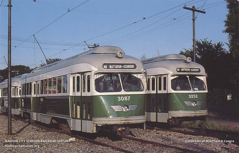 PCC cars 3087 and 3252, built by Pullman-Standard in 1945 and 1946 respectively, bask in the late afternoon sun at the Mattapan Terminal of the MBTA's Mattapan-Ashmont "High Speed Trolley Line" in August 1982. In 1994 the only remaining active PCC cars in Boston are the twelve rebuilt "wartime" PCCs used on this line. These all-electric cars, outfitted with Westinghouse electrical equipment, are 46 feet long, 100 inches wide, and have 41 seats. Streetcar operation between Mattapan and the Ashmont terminal of the Red Line began in December 1929. The line utilizes the rights-of-way of the former New Haven Railroad Old Colony Shawmut and Milton Branches.