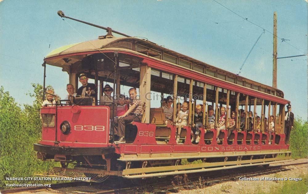 Open cars used to be a summer favorite to parks, picnics, beaches, or just to cool off. Open cars like 838 (built in 1905 by J. M. Jones's Sons for New Haven, Connecticut) run daily during the summer season for museum visitors. "World's Oldest and Largest Electric Railway Museum."