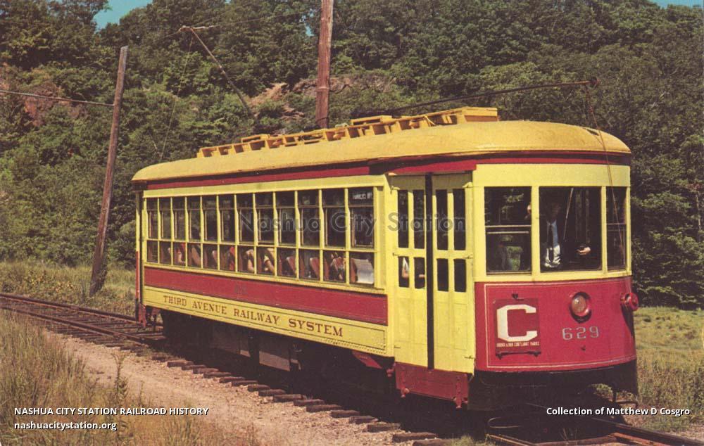 No. 629 was built in 1939 by the Third Avenue Railway System and served Manhattan and The Bronx for nine years. In 1949 it went with 39 other New York trolleys to Vienna as postwar aid where they ran until 1966. In 1967 the Austrian Government donated it to the museum, and the journey to Connecticut included a day's exhibition in Central Park. For 3 years the car operated as 4239 in Vienna colors. In 1970 the museum repainted it inside and out, and it returned to operation as Third Avenue 629. Schedule of Trolley Operation for Visitors: July and August - daily; June and September - Saturday & Sunday; April, May, October, November - Sunday.