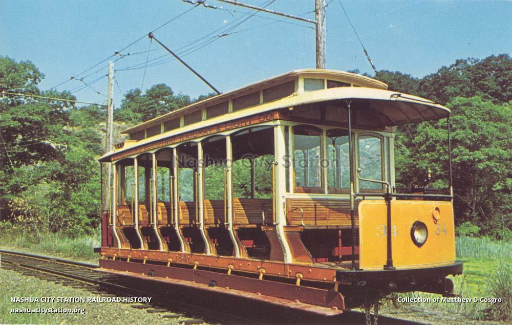Single-truck open car #34 was built in 1899 (Jackson & Sharp) for Lynchburg (Virginia) Electric Railway & Light Co. It operated there until 1929, then ran in Wildwood (New Jersey) thru 1943. In 1946 it became the first trolley acquired by the museum. Present restoration was completed 1978; project director Thomas M. Shade. Schedule of Trolley Operation: Open 11 AM - 5 PM: July and August - daily; June, September, October - Saturday and Sunday; April, May, November - Sunday.