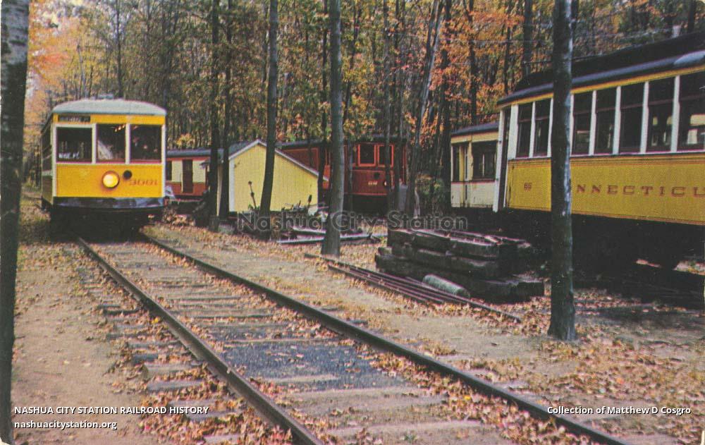 Car #3001 of Connecticut Company passes yard on its way to North Road Trolley Station with a carload of tourists. The public can ride the trolleys every Sunday, July through October.
