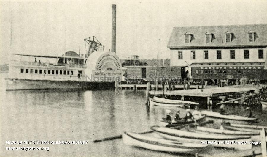 Wolfeboro Dock Station about 1880, showing Eastern Railroad train connecting with B&M Steamer "Mt. Washington". The large B&M Building in the rear burned in 1899. The Boston, Concord & Montreal Railroad Steamboat "Lady of the Lake", docked at the pier in the foreground so that this spot was a junction of three different railroads.