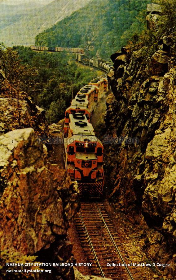 Maine Central Railroad Train RY-2 with four locomotives hauling nearly 100 cars through the gateway in Crawford Notch in New Hampshire's White Mountains. The Mountain Sub-Division which operates from Portland, Maine to St. Johnsbury, Vermont is an important Maine Central Freight Route, moving traffic to and from the West and South.
